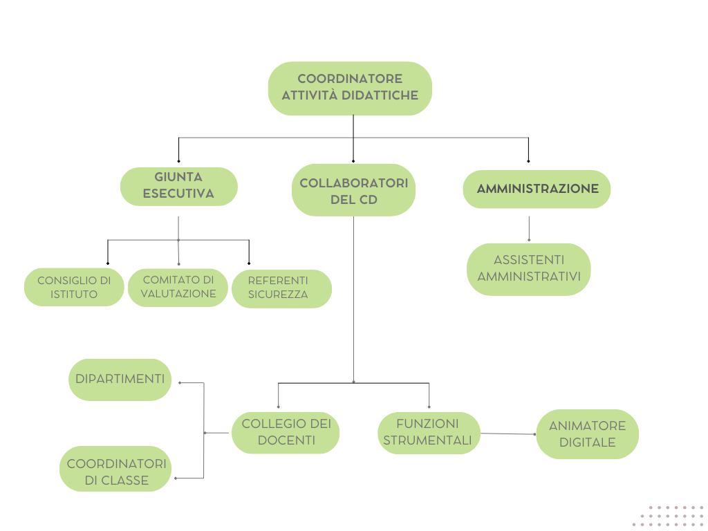 Al vertice c’è il Coordinatore delle Attività Didattiche, che si avvale della Giunta Esecutiva, composta dal Consiglio di Istituto, dal Comitato di Valutazione e dai Referenti Sicurezza.